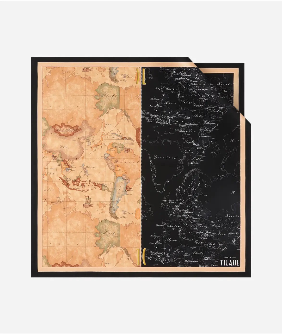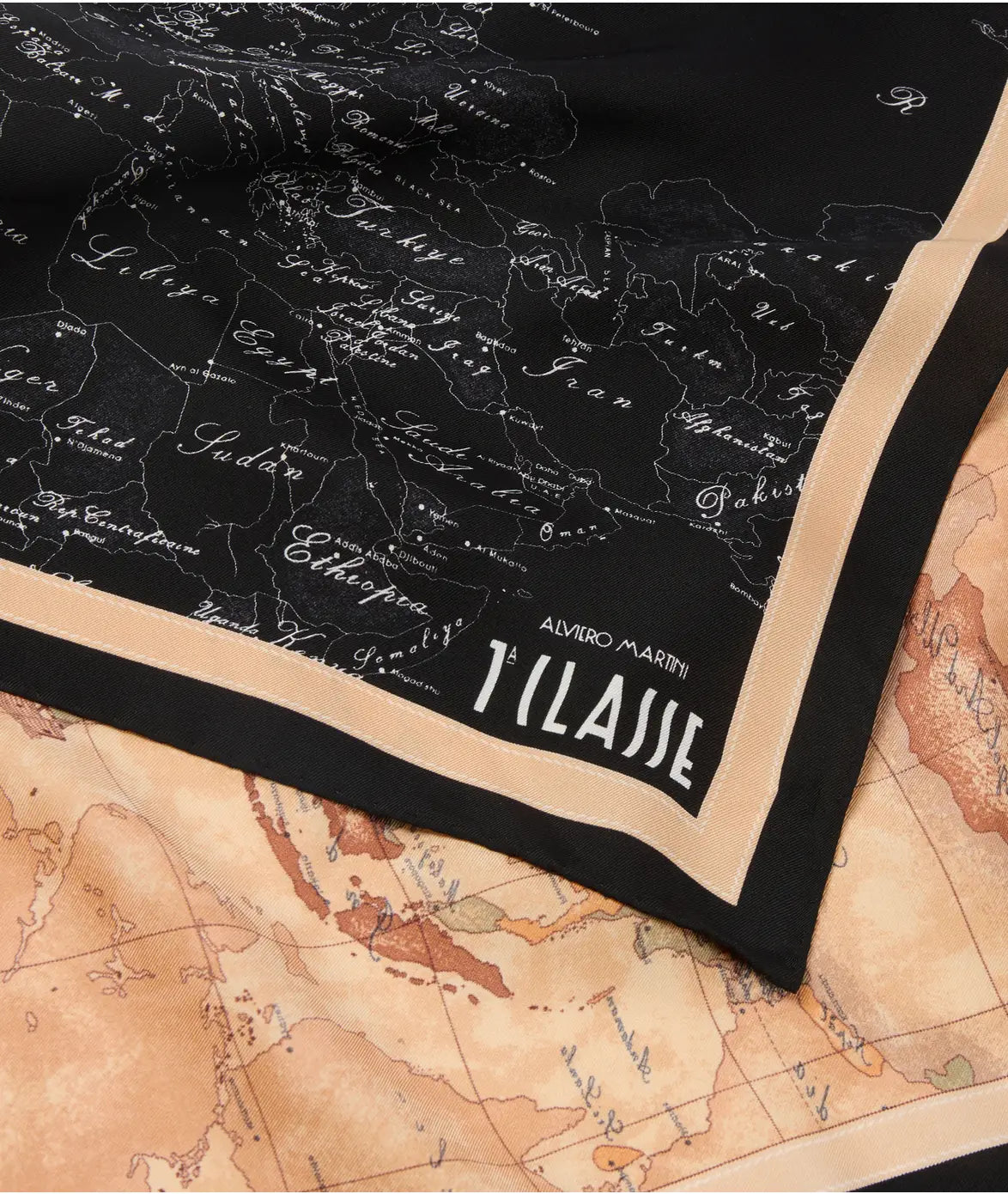 Il foulard in seta Eclipse Geo propone la mappa del brand in versione diurna e notturna, per un look contrastato e d'impatto. Indossalo nei capelli, al collo o aggiungendolo alle borse di Collezione come dettaglio inaspettato, risulterà sempre iconico.