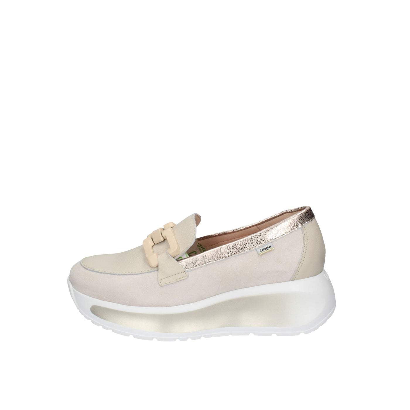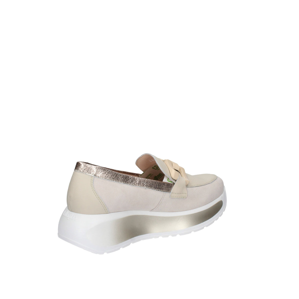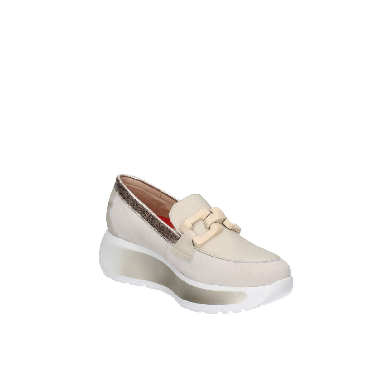 La suola è spessa, bianca con inserti grigi, e presenta una forma leggermente rialzata, offrendo comfort e supporto per tutto il giorno.
