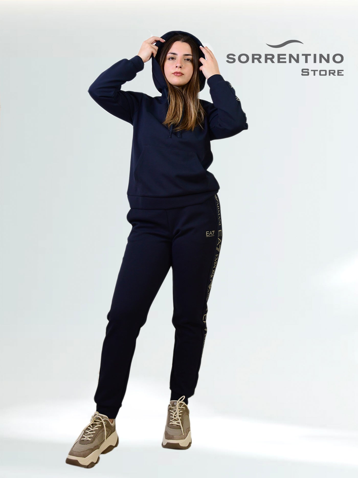 La tuta completa da donna EA7 unisce stile sportivo e comfort quotidiano, firmati Emporio Armani. Realizzata con una composizione di 78% poliestere e 22% cotone, questa tuta offre una vestibilità morbida e traspirante, ideale sia per il tempo libero che per l'attività fisica. Il set comprende una felpa con cappuccio dotata di ampia tasca frontale e pantaloni dal taglio dritto, entrambi impreziositi dal logo EA7 a contrasto sulle maniche e sulle gambe. I dettagli logati e il design moderno rendono questo completo perfetto per chi desidera un look dinamico, raffinato e riconoscibile, senza rinunciare alla praticità.