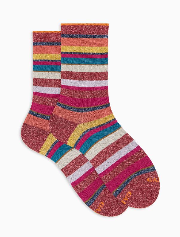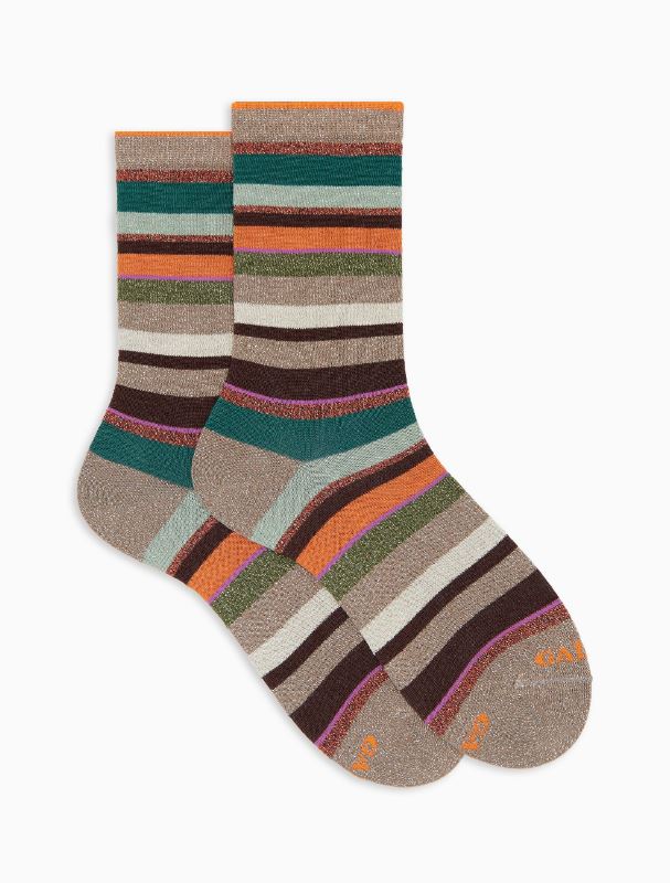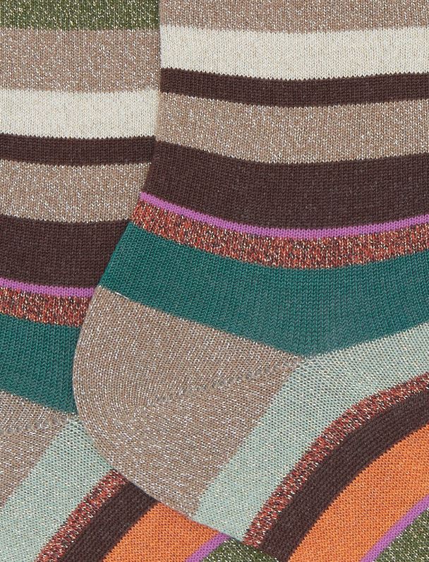 Calze corte da donna realizzate in Italia con un blend di filati. Molto morbide al tatto, create per una persona dinamica che non rinuncia ad un dettaglio di stile. L'iconica fantasia a righe multicolor nei toni del beige le rende originali ma riconoscibili. Adatte ad un look formale o stravagante
