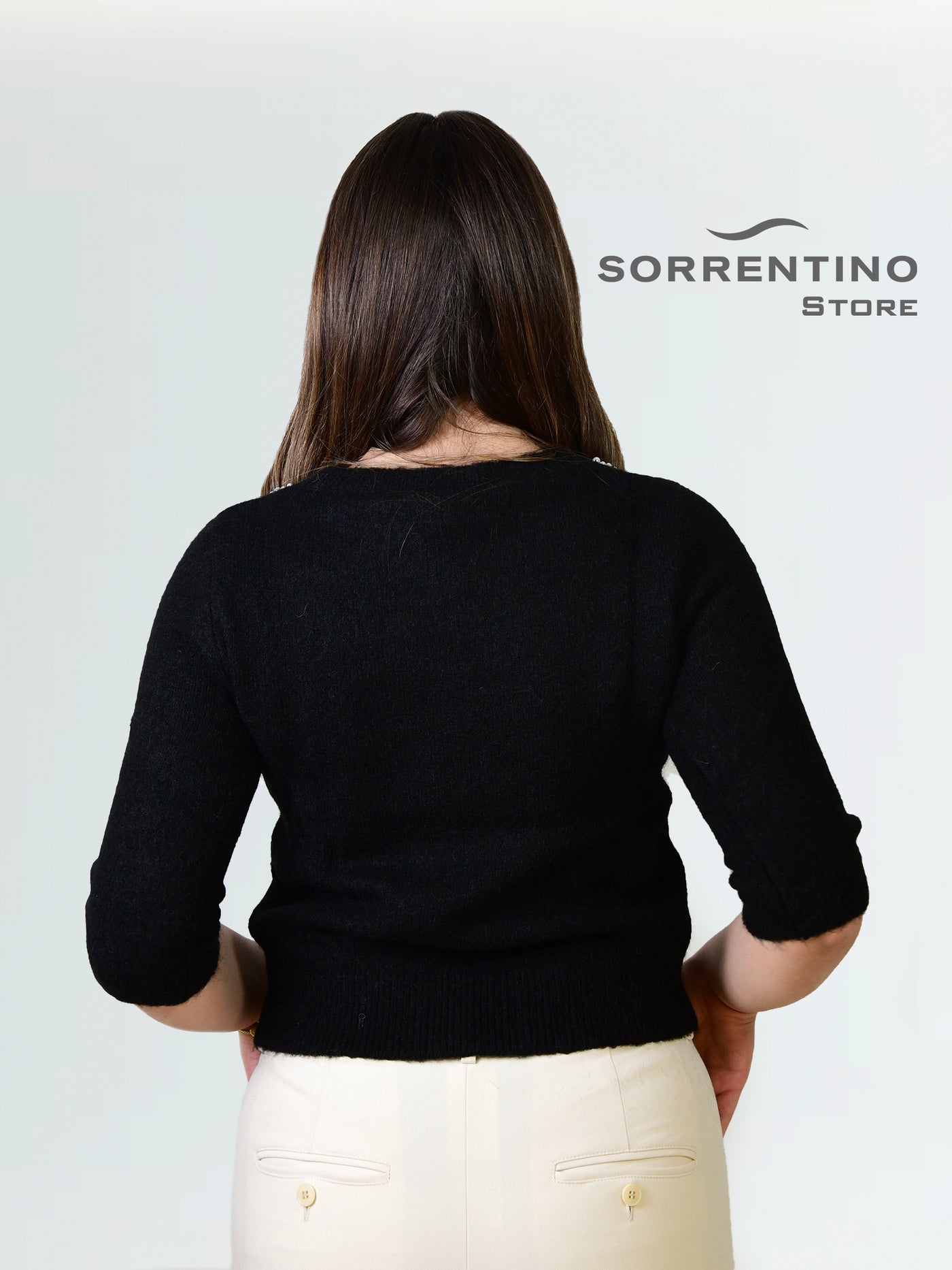 Lo stile classico di questa maglia con maniche a tre quarti è sottolineato dal dettaglio in perle sullo scollo e sul davanti. Il capo presenta lo scollo rotondo e bordi a costine.