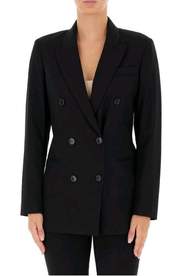 Linea dritta e taglio maschile caratterizzano questa giacca da donna doppiopetto con collo a revers ed eleganti tasche a filetto.
