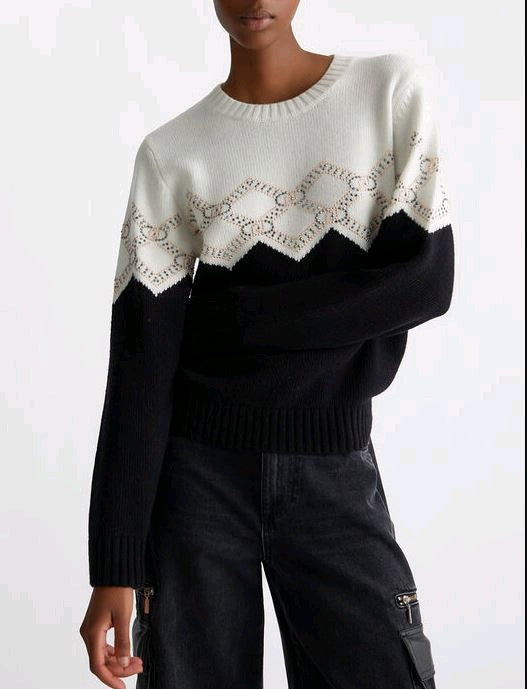 La maglia è realizzata in misto lana con motivo geometrico con logo e strass.