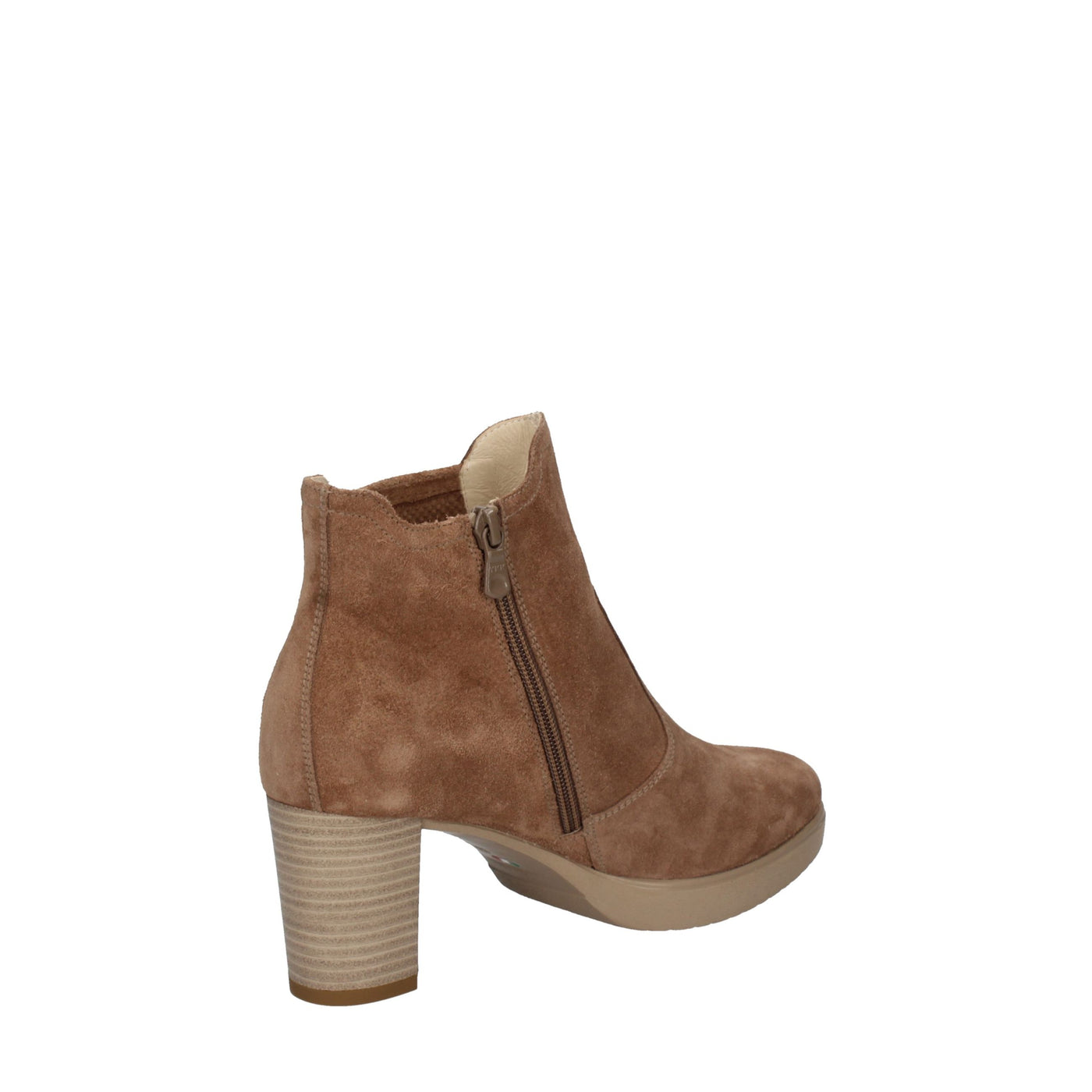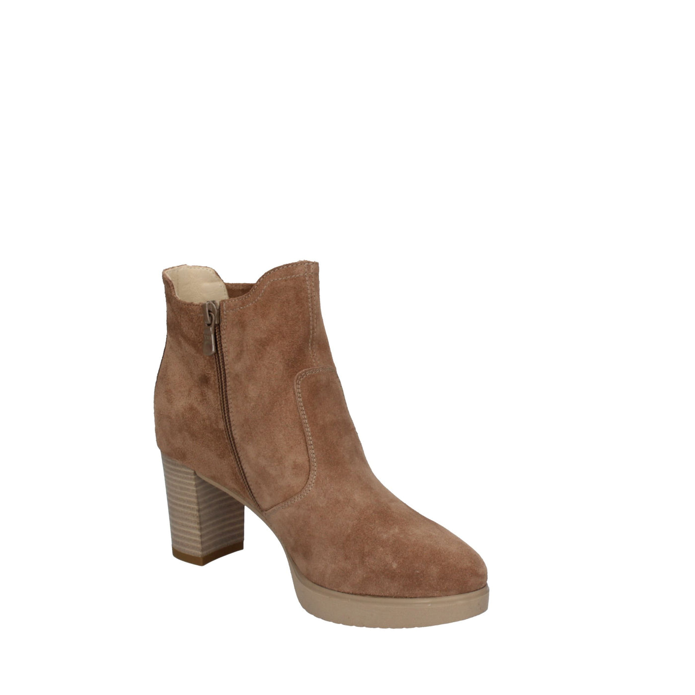 Stivaletto camoscio tortora mou con tomaia forata sul laterale, tacco di 7 cm e platò che lo rendono versatile e comodo.