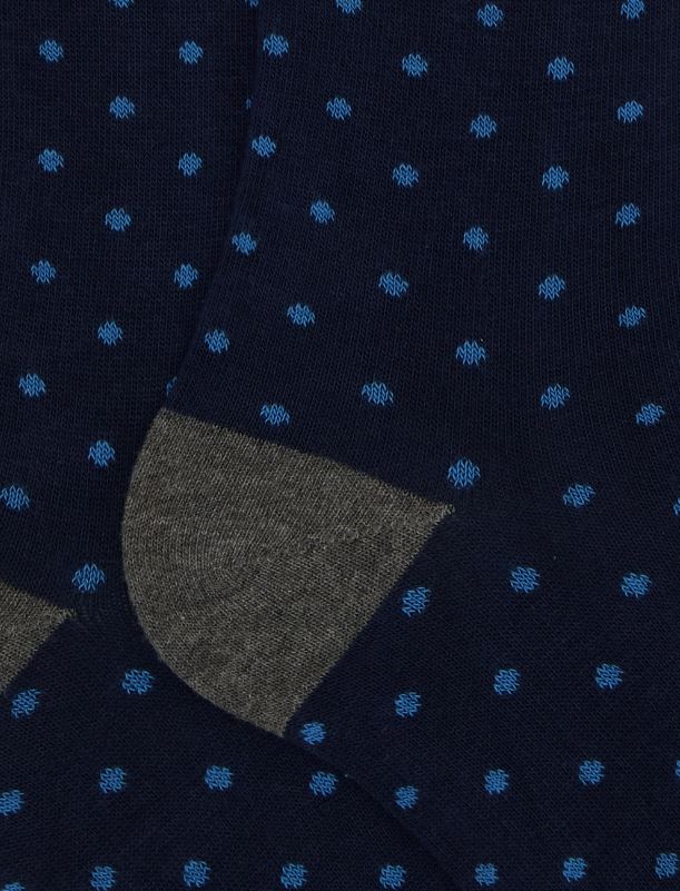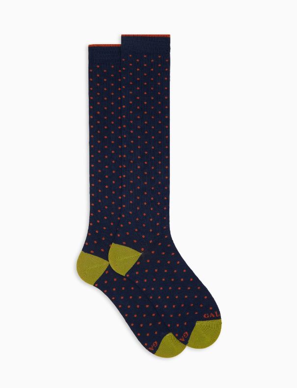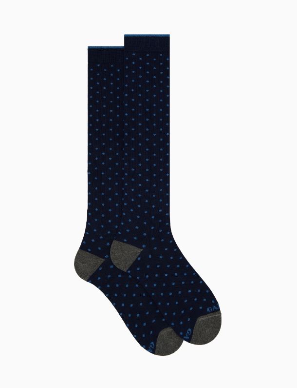 Calze lunghe da uomo realizzate in Italia in morbidissimo cotone. L'iconica fantasia a pois, nei toni del blu, rende queste calze immediatamente riconoscibili e perfette da abbinare ad ogni tipo di look. Il brand Gallo è in punta a contrasto. Sinonimo di qualità ed eccellenza dal 1927.